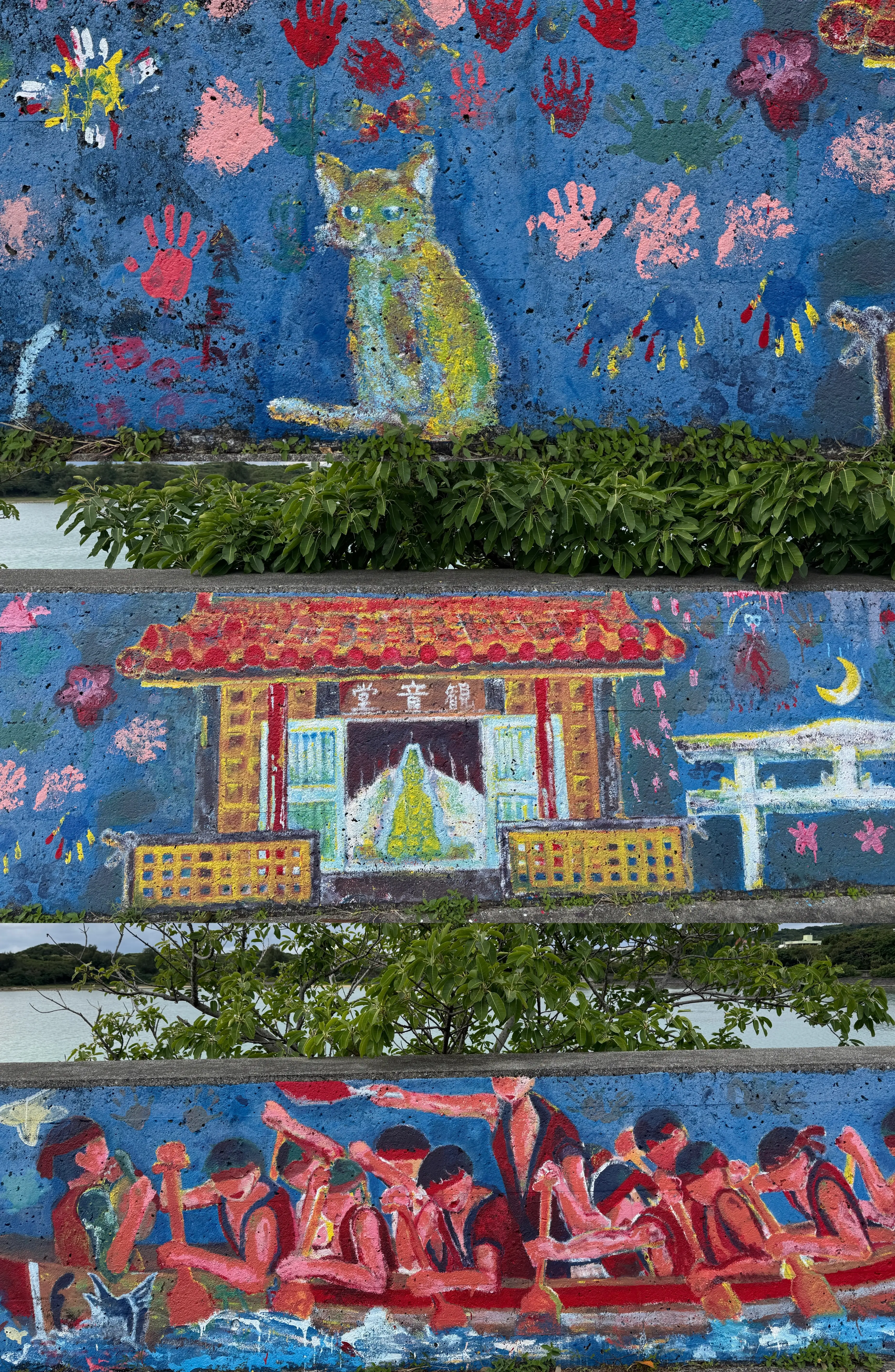 沿着堤坝散步可以见到很长的壁画一路蜿蜒,画中呈现的是岛上的风物和活动。绚丽而浓烈的色彩使得庆典和人物看起来栩栩如生,欢腾热闹得仿佛把阳光与海洋的力量在画中煮沸了。而我们走过的地方却静得只剩风和海浪声。这种神秘的错位感令人恍惚,两个世界在同一个空间里重叠了。
